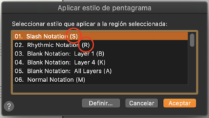 En todo caso, siempre puedes buscar las teclas de las Metaherramientas para aprendértelas en el transcurso. Para las Herramientas de Articulación y Expresión, las teclas aparecerán en el cuadro de diálogo de Selección de Articulaciones y Selección de Expresiones. Busca un elemento particular en ese cuadro de diálogo. Cuando lo encuentres, mira hacia la esquina superior derecha del recuadro. La letra o número que ves ahí es la Metaherramienta que le corresponde a ese elemento. En otros lugares, aparecerán entre paréntesis al lado del nombre de un elemento determinado. En el cuadro de diálogo de Selección de Estilos de Pentagrama, por ejemplo, lo verás así. Apréndetelos sobre la marcha. Si con frecuencia escribes para cuerdas, pronto te darás cuenta de que los textos sobre técnica “arco” y “pizz.” tienen una “O” y una “P” en la parte superior derecha de sus casillas correspondientes, así que ahora podrás empezar a utilizar estas letras como Metaherramientas y a ahorrarte mucho tiempo cuando añadas esas instrucciones de técnica comunes.